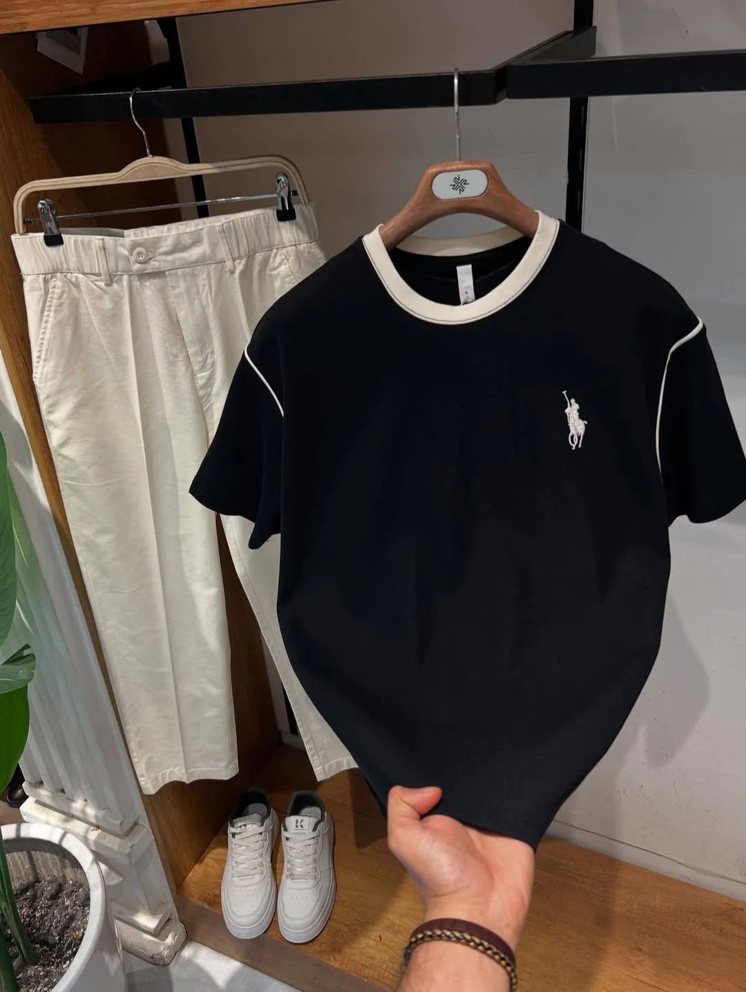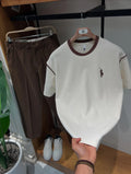A premium tees & cords set designed for a rich, classy casual look. The cream T-shirt with contrast brown piping pairs perfectly with the soft brown cords, delivering a refined and modern aesthetic ideal for everyday luxury wear.