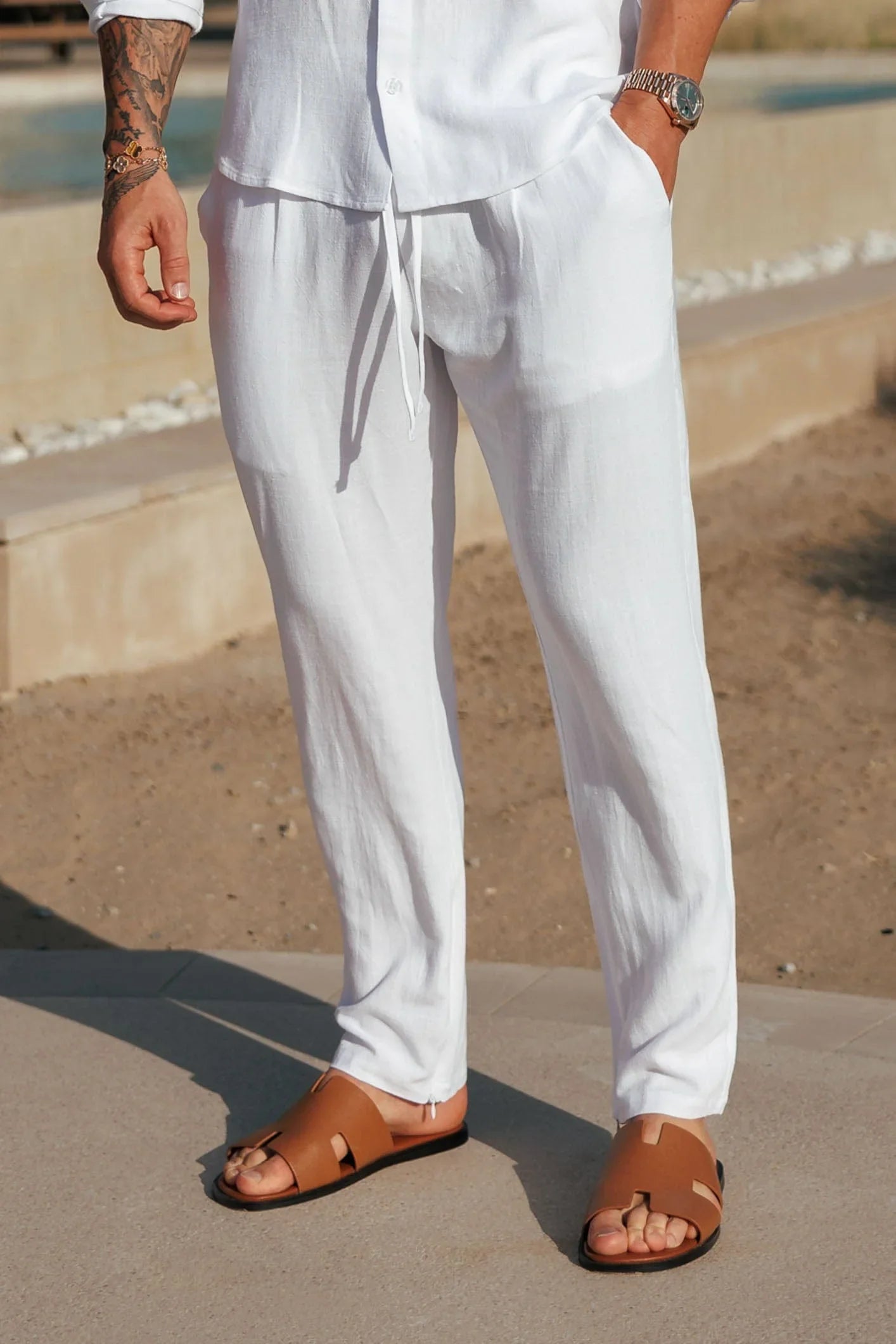 With its tailored shirt and drawstring trousers, the set balances sophistication and ease, making it a versatile wardrobe essential. Lightweight, soft, and timeless, it transitions seamlessly from beachside strolls to rooftop gatherings.